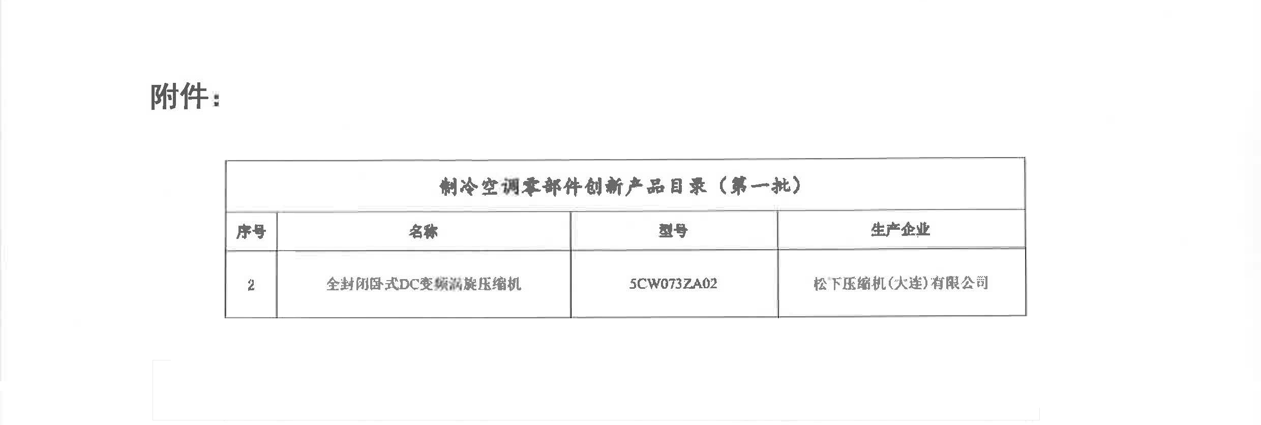 【概要描述】近日,中國(guó)制冷空調(diào)工業(yè)協(xié)會(huì)發(fā)布了《制冷空調(diào)零部件創(chuàng)新產(chǎn)品目錄(第一批)》。松下壓縮機(jī)(大連)有限公司申報(bào)的全封閉臥式DC變頻渦旋壓縮機(jī)5CW073ZA02在行業(yè)百余個(gè)產(chǎn)品的角逐中脫穎而出,通過(guò)了行業(yè)專家的嚴(yán)格評(píng)審,成功入選該目錄。
